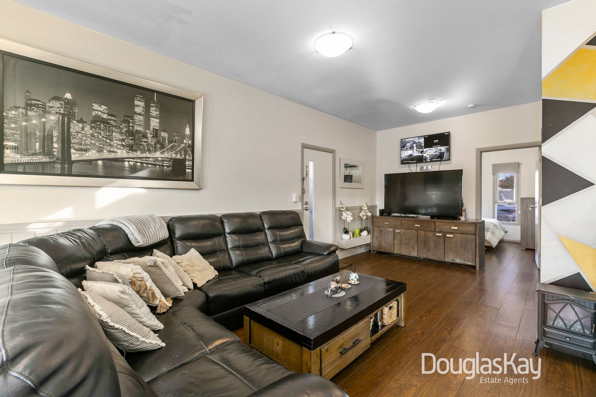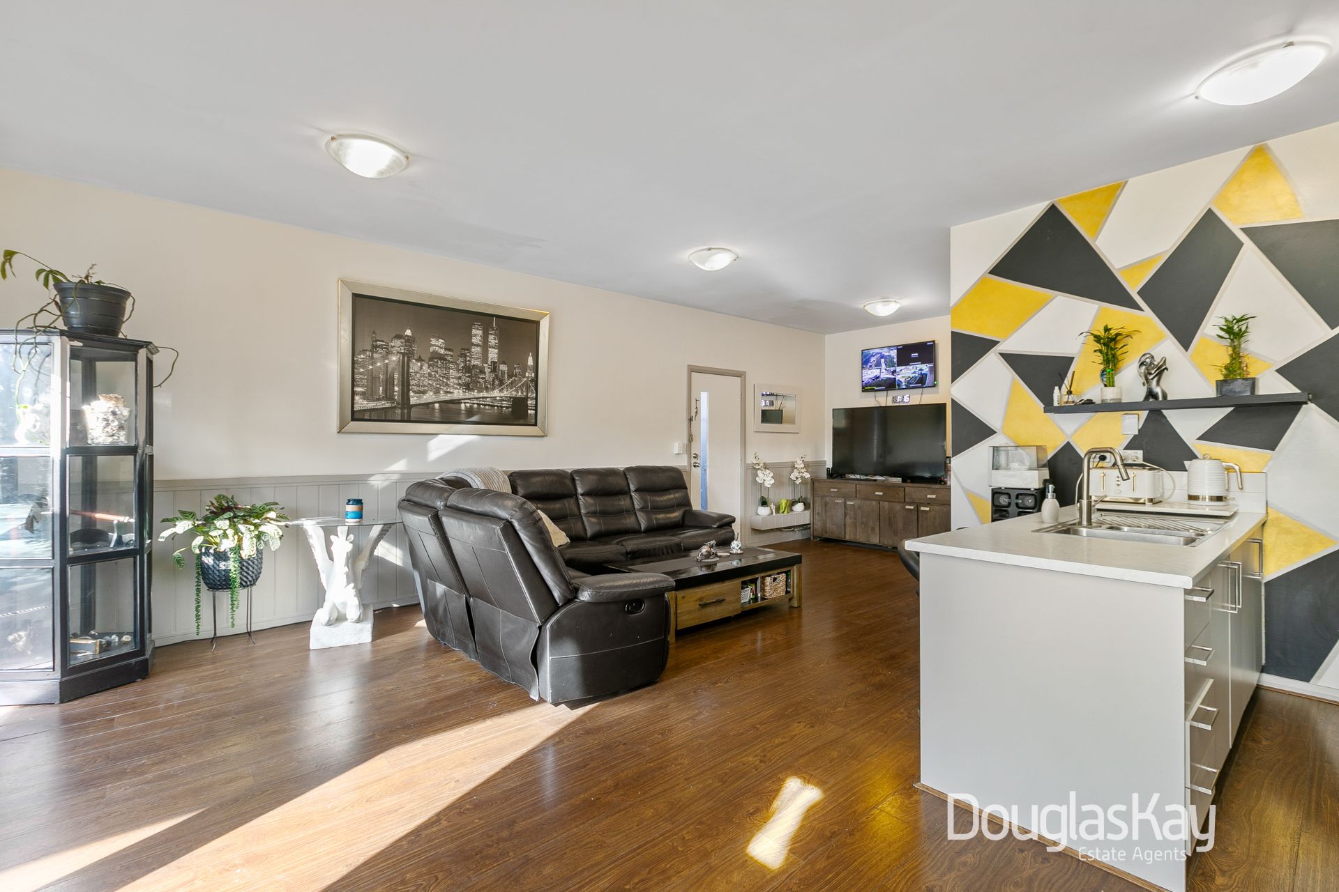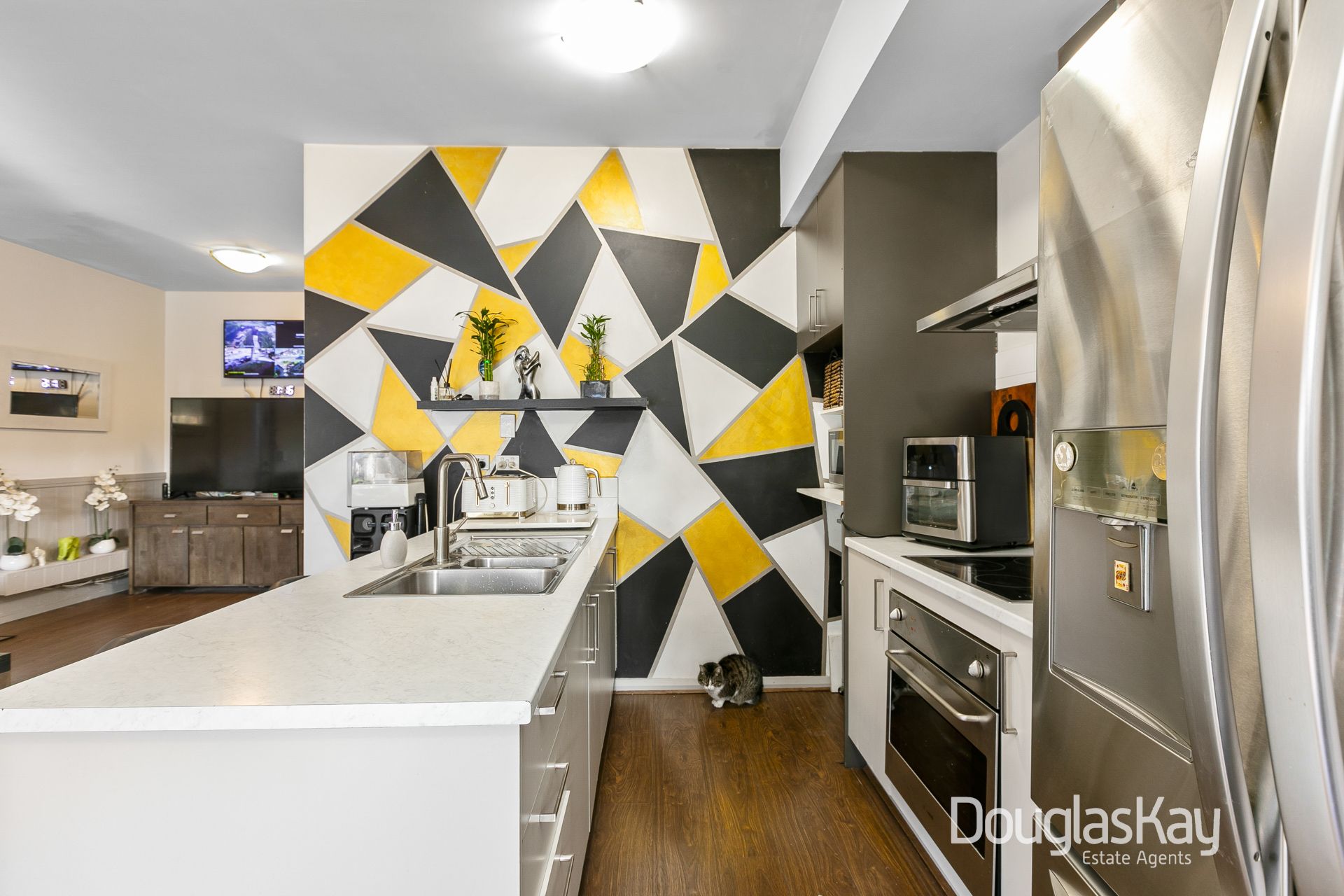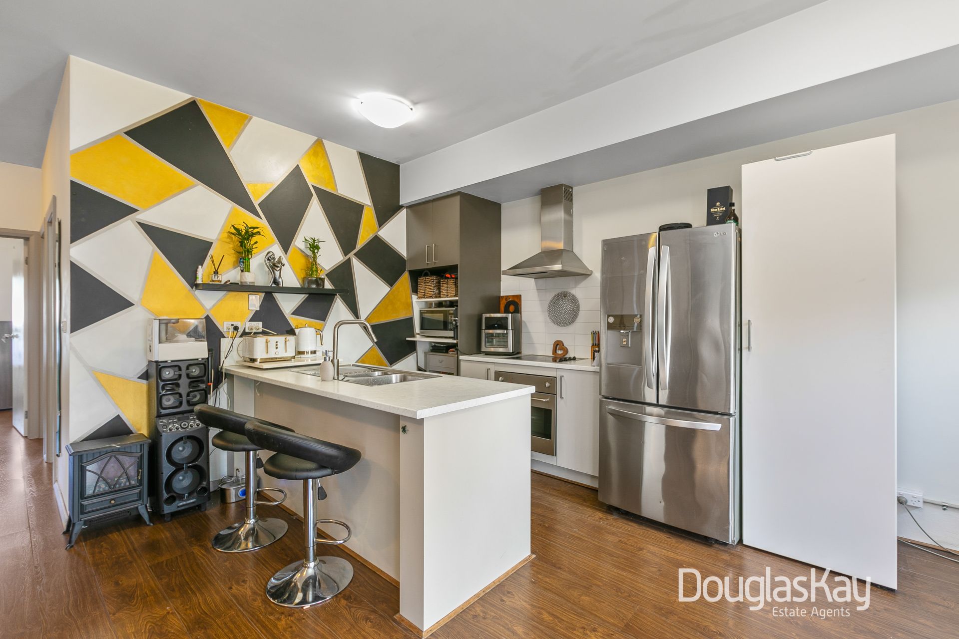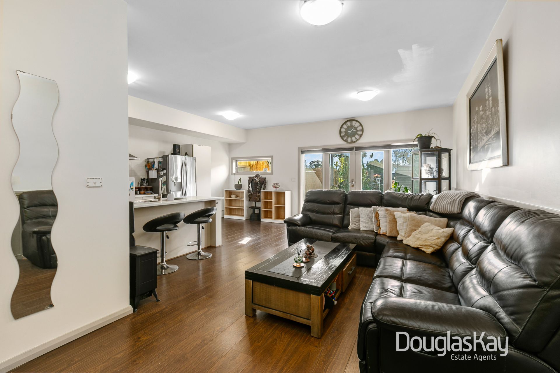 Bathed in natural light, the generously proportioned open plan living and dining area provides a warm and inviting space to relax and unwind. The contemporary kitchen is thoughtfully designed, complete with a breakfast bar, stainless-steel appliances, and ample storage.