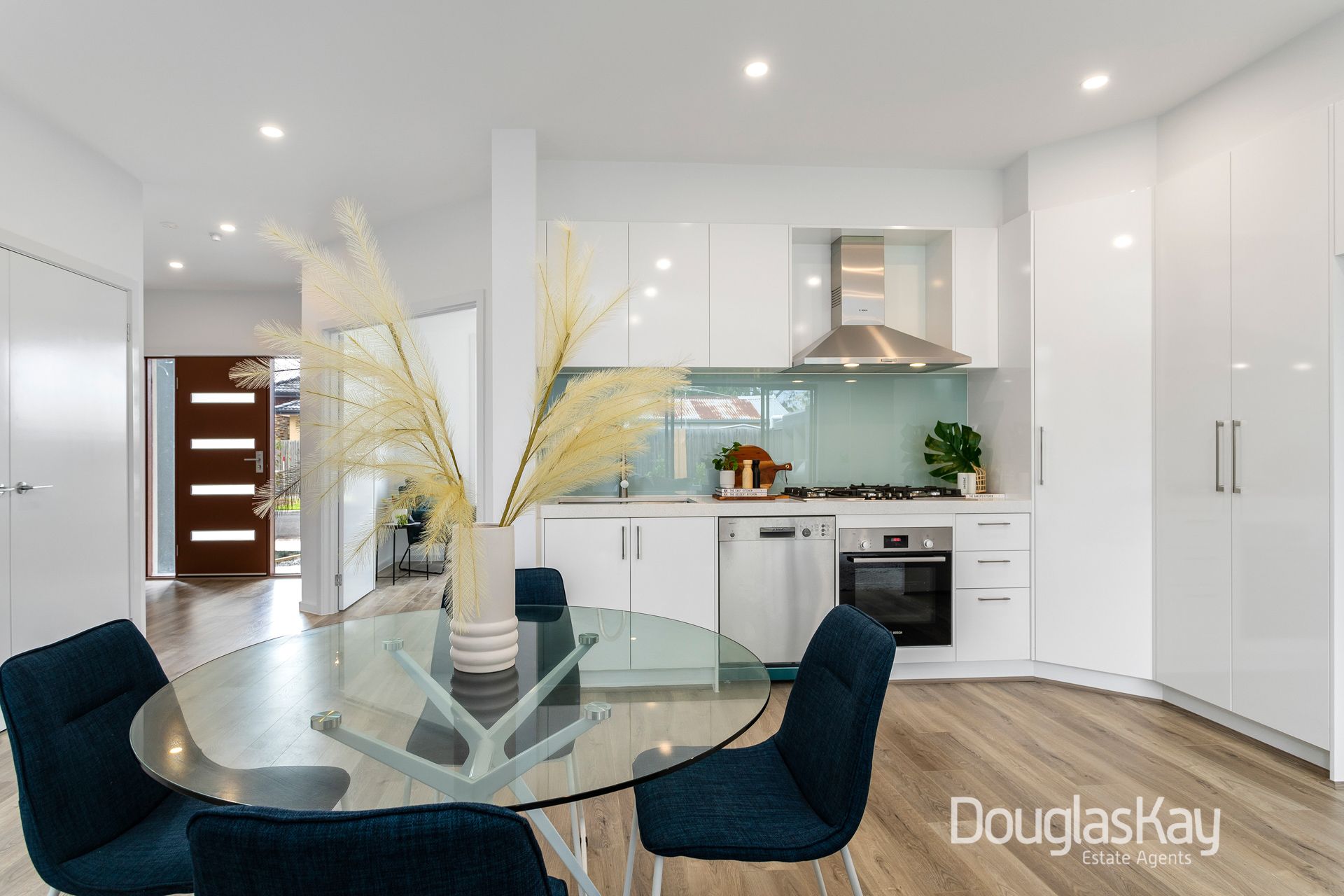 _white sheen cabinetry, dapple white stone benches, glass splash backs