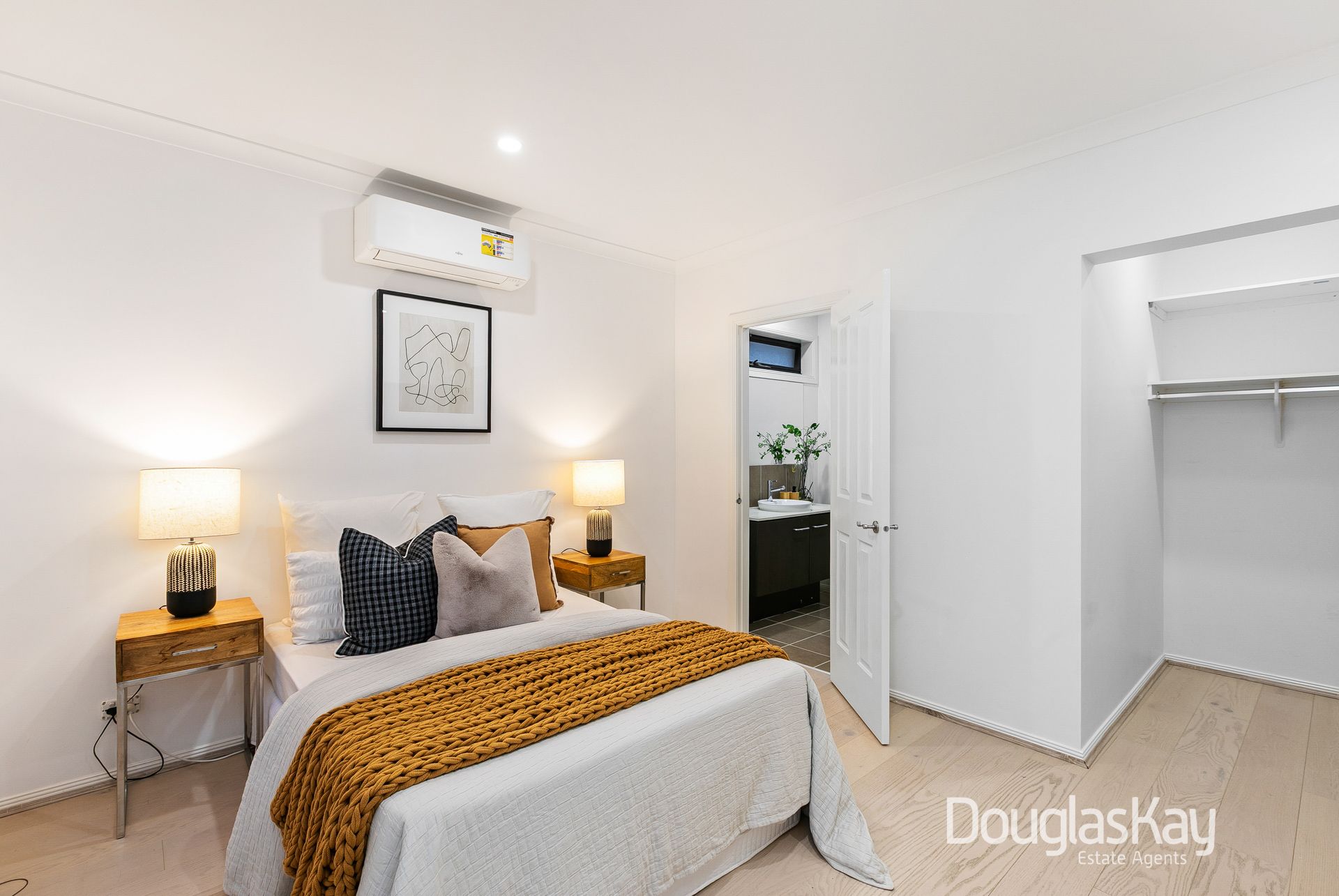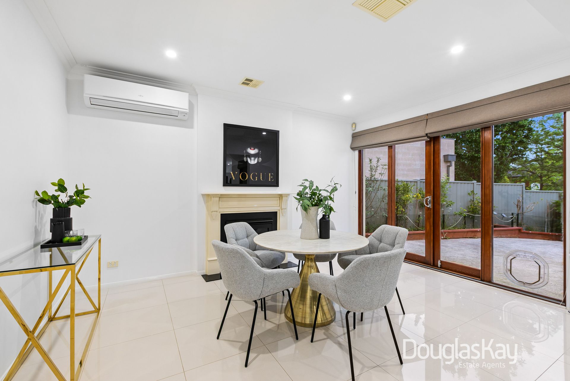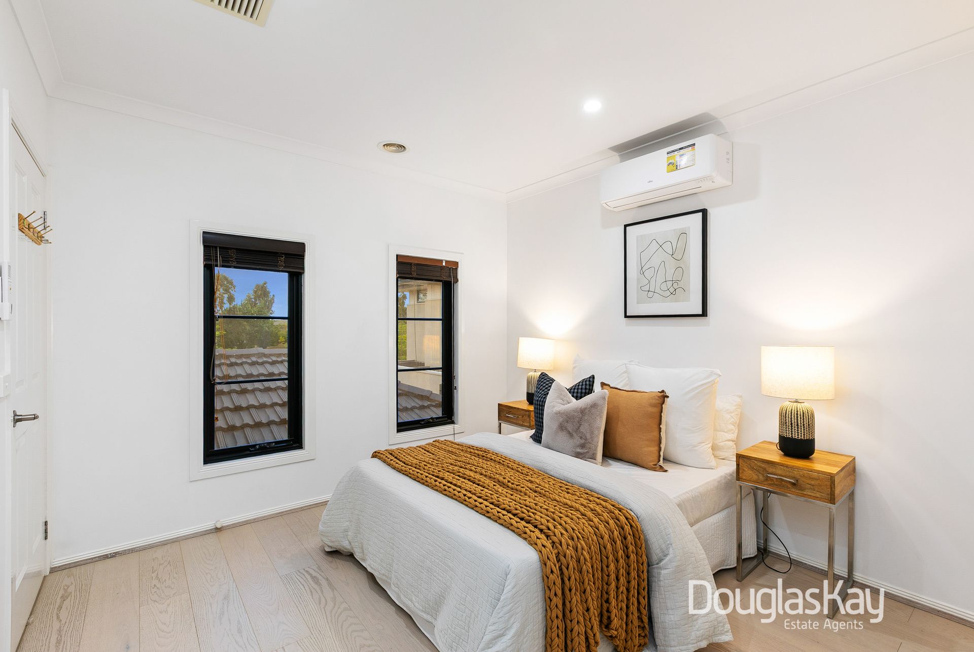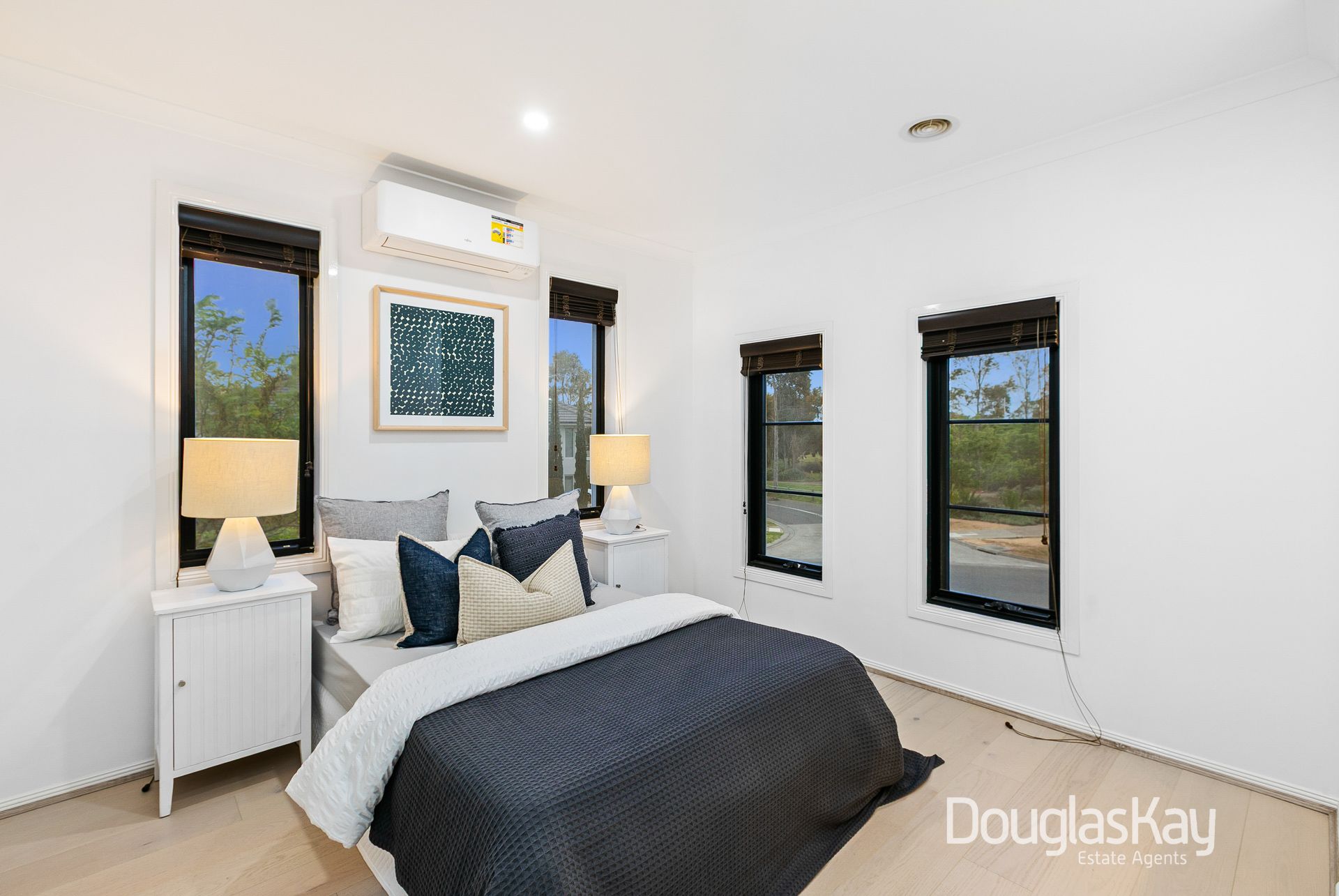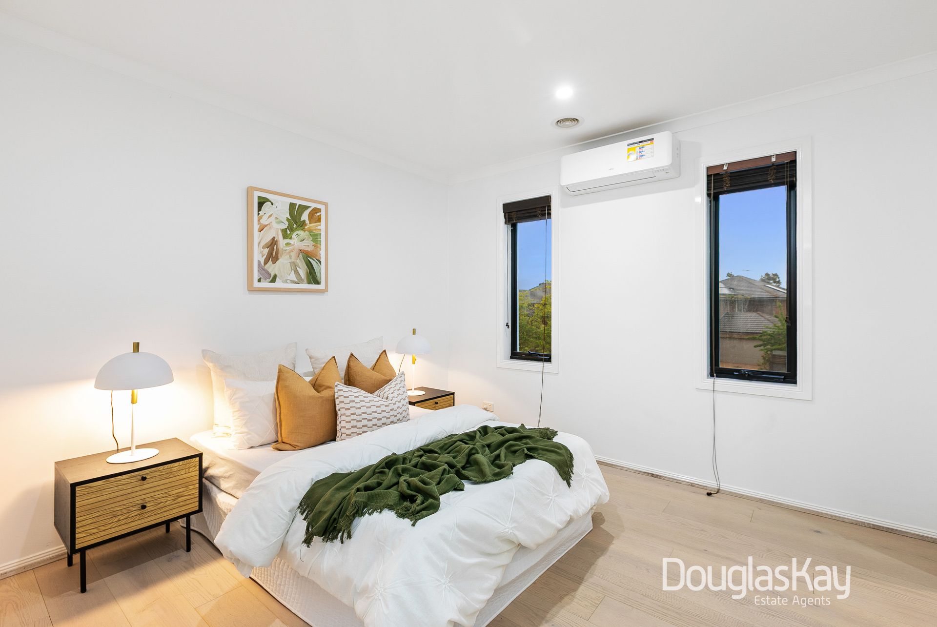 Additional highlights include split-system air conditioning throughout, a downstairs powder room, full-size laundry, linen closet, garden shed, and an oversized double garage with internal access.