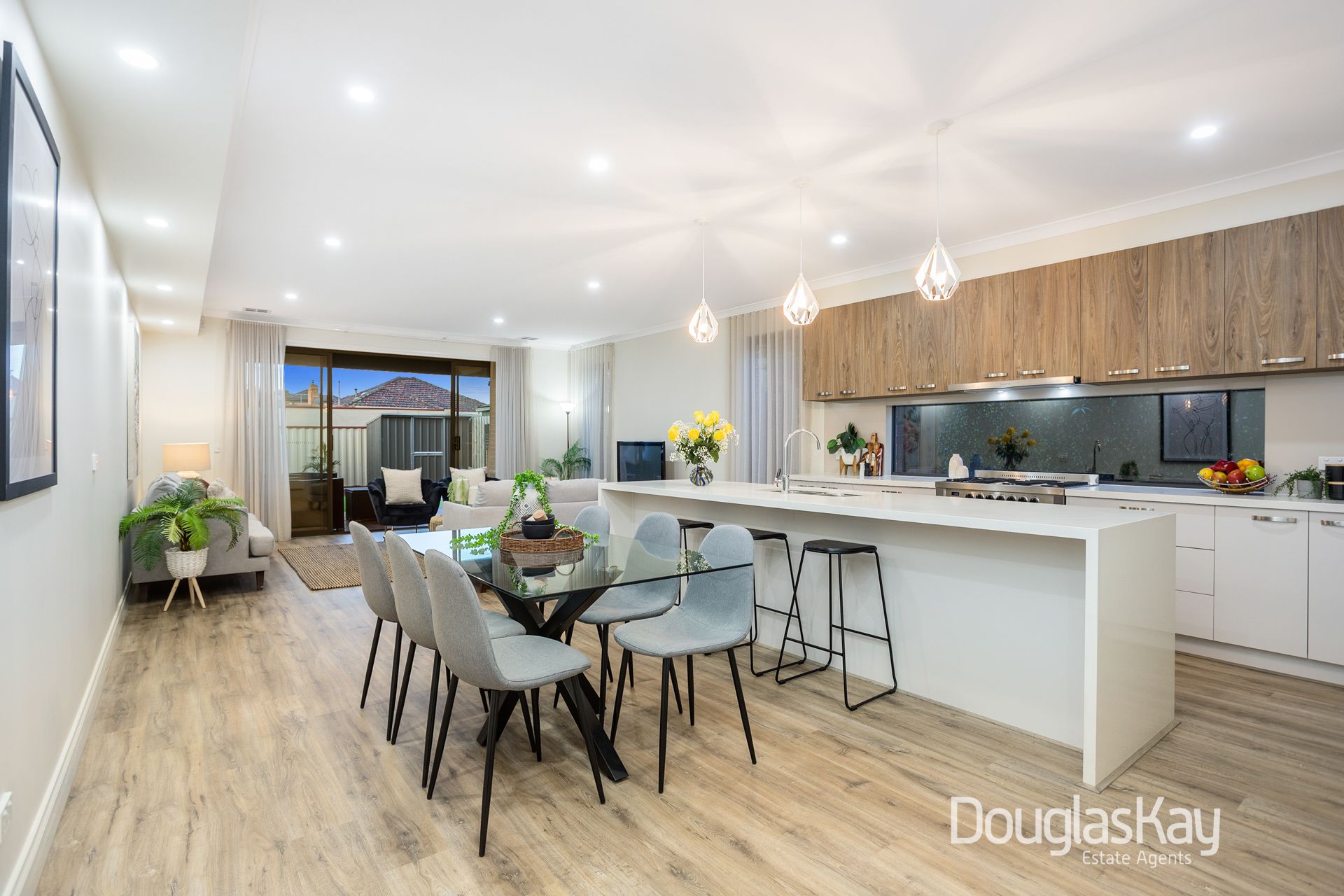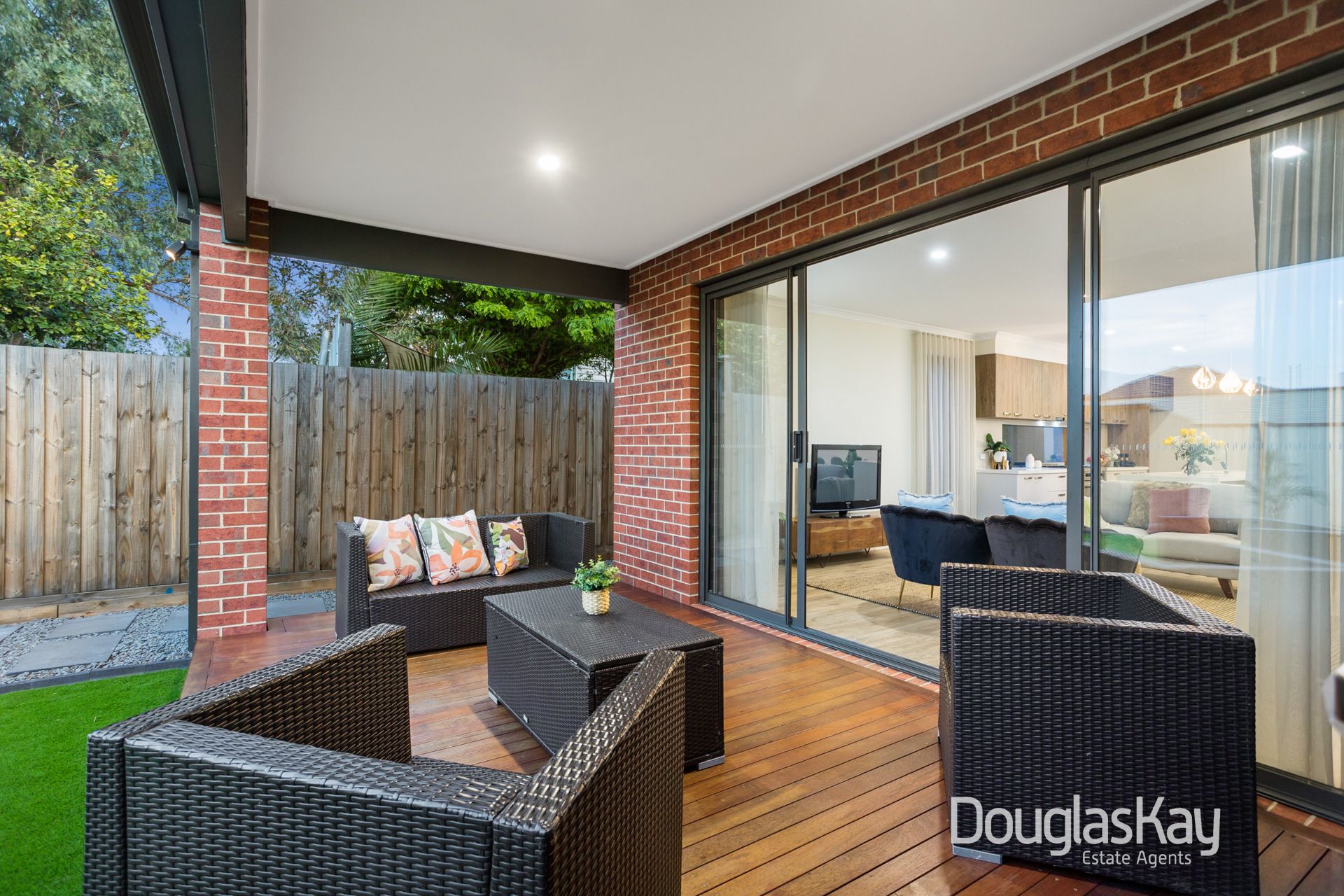 _An open-plan living and dining area that seamlessly leads to a low-maintenance alfresco space with timber decking and a storage shed