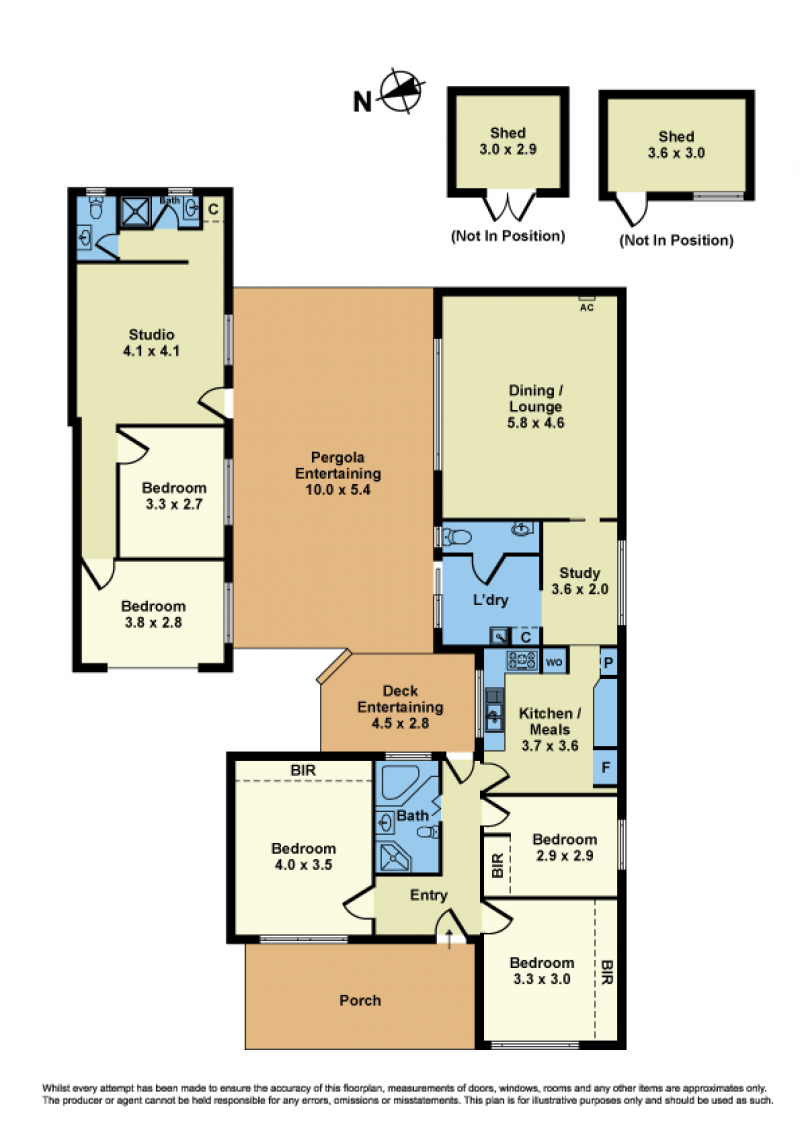 Additional highlights include a versatile home studio and study, heating and cooling for all-season comfort, security roller shutters, and a convenient garden shed.