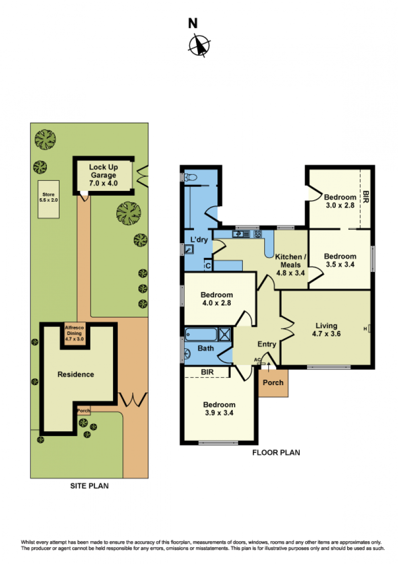 The floor plan provides a formal entrance, four bedrooms, a central bathroom, toilet, laundry, and a meals/kitchen area at the rear. Additional features include a lock-up shed, split system cooling & heating.