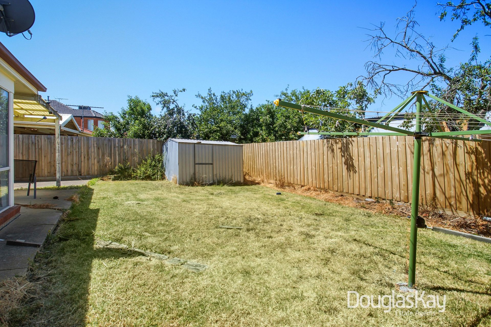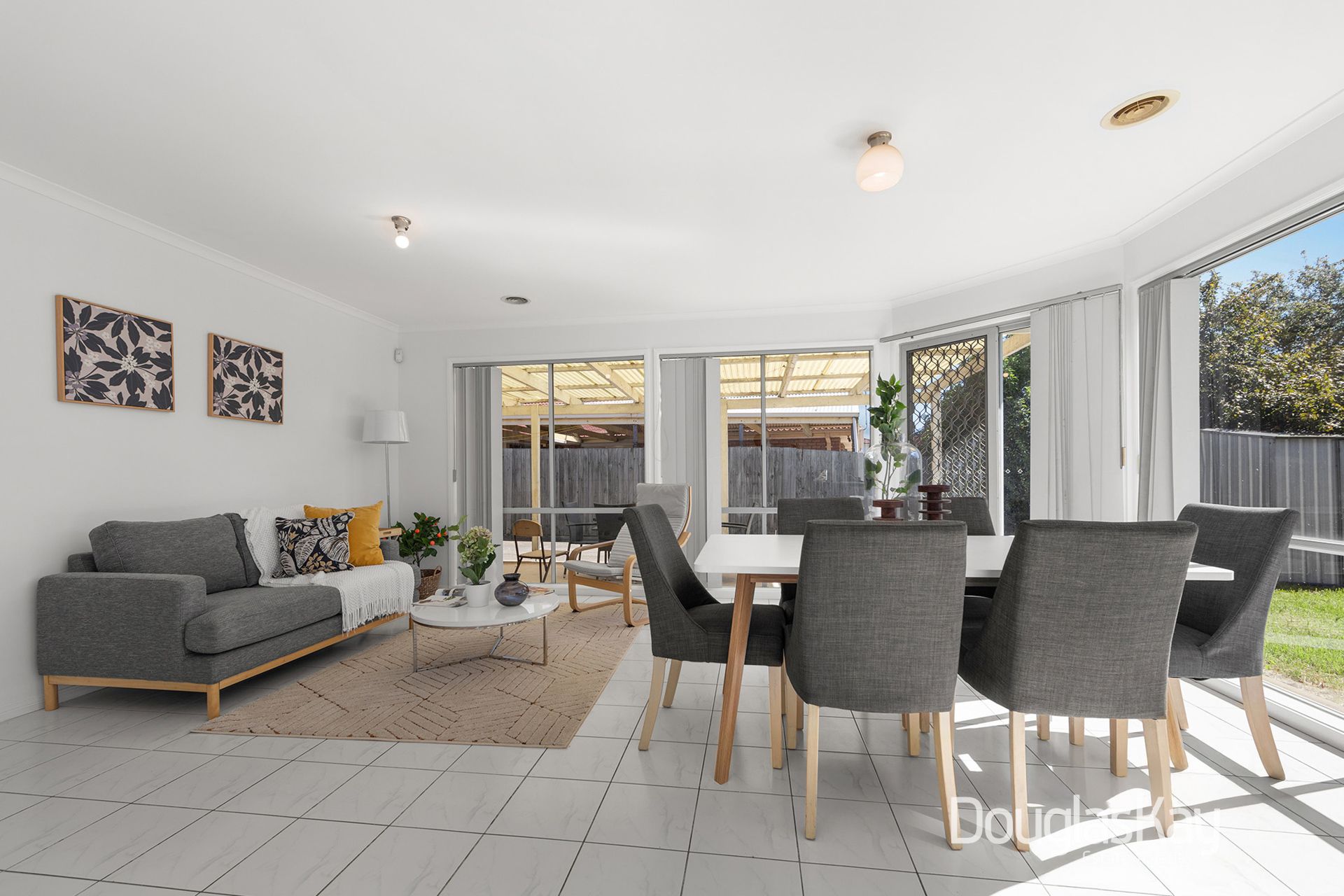 The well-appointed kitchen is tucked away and offers ample cabinetry, a step-in pantry, and an adjoining open-plan dining and living area that flows seamlessly to a large pergola, creating an ideal setting for year-round indoor–outdoor entertaining.