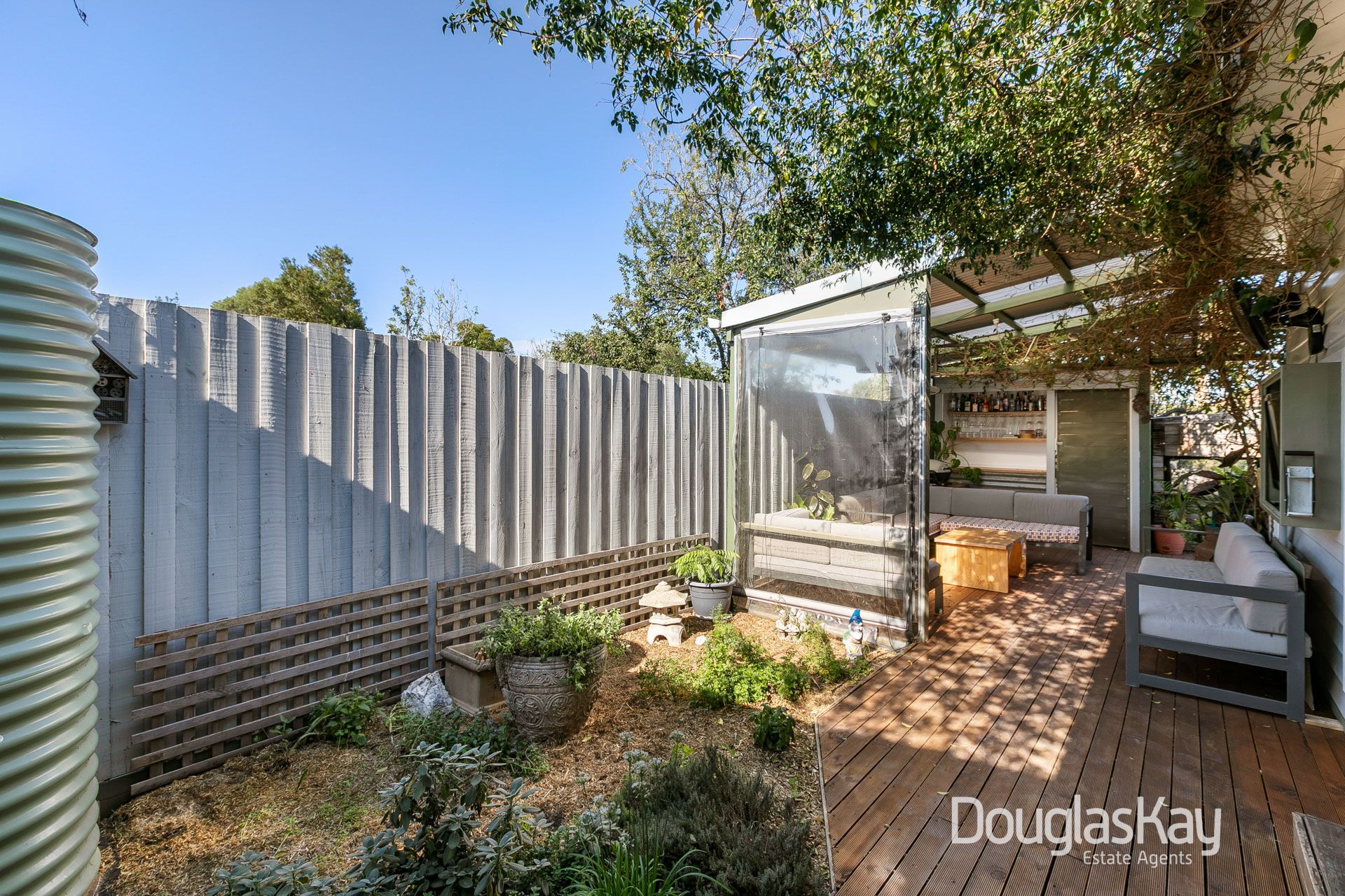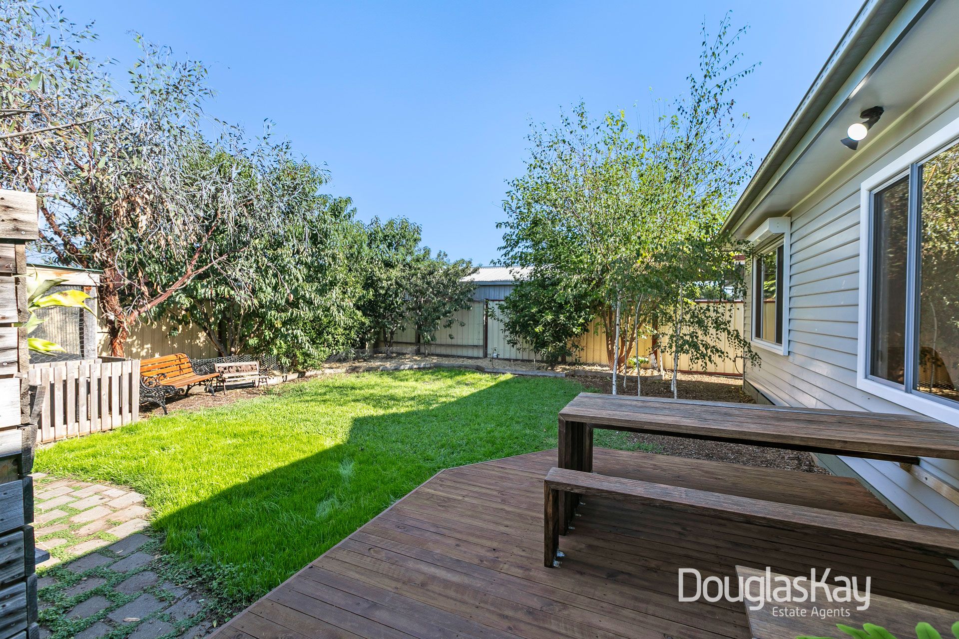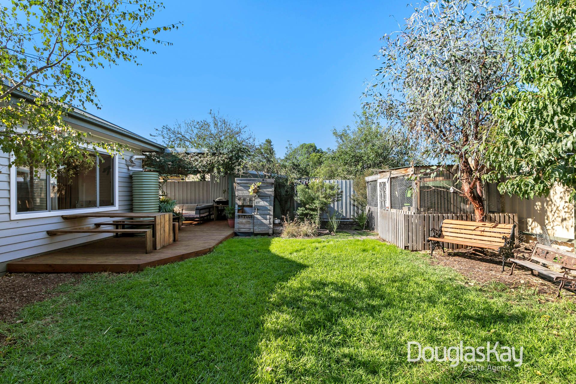 For outdoor entertainment, the undercover area includes a lounge, BBQ, TV, and cocktail bar, perfect for lazy Saturday afternoons. The deck wraps around the house and opens to the backyard. A picnic table offers warmth in the morning and protection from the western sunsets, making it perfect for outdoor dining. The washing line is discreetly located behind the shed, serviced by a path that also leads to a secure walk-in chicken coop, while established fruit trees surround the perimeter.