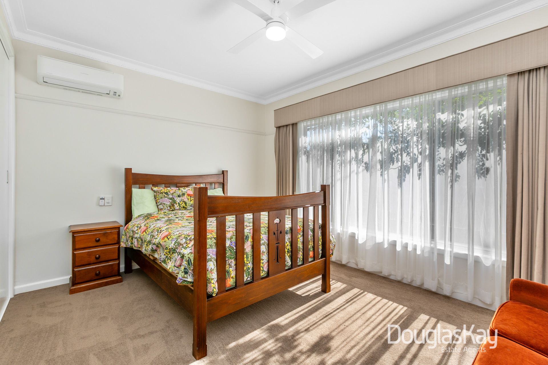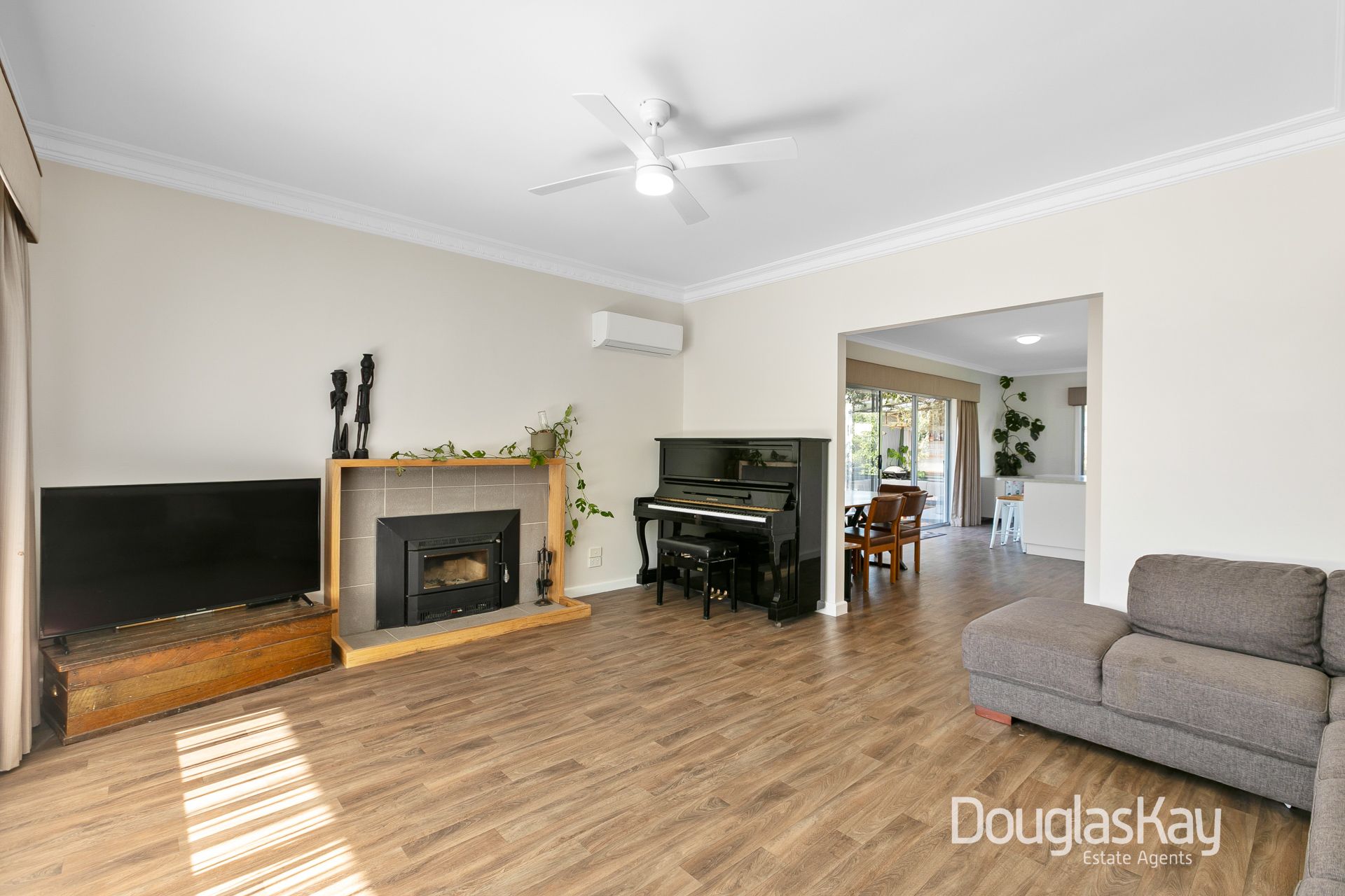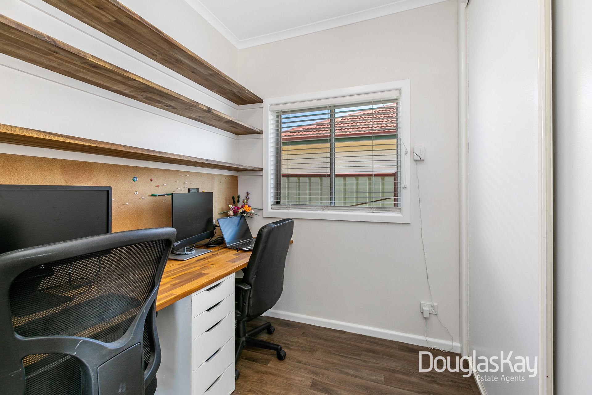 This thoughtfully designed family home offers an ideal layout for modern living. The front master bedroom is a peaceful retreat, featuring built-in robes, an ensuite, reverse cycle air conditioning, and roller shutters for privacy and climate control. Adjacent is a quiet home office with upgraded acoustic insulation, perfect for work or study. A door from the office allows shared use, offering flexibility.