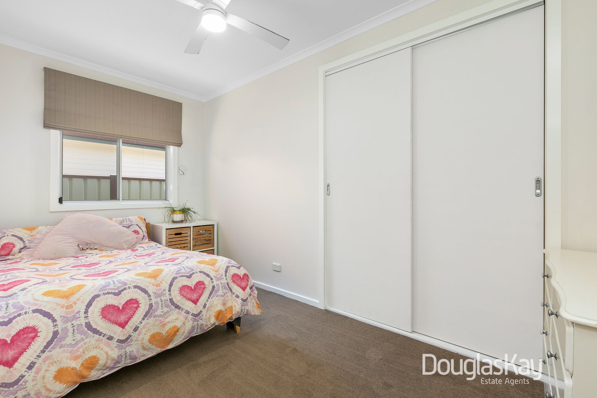 The kids' wing includes three generous bedrooms with built-in robes, ceiling fans, and roller shutters for added thermal and acoustic comfort. The wing is conveniently connected to a walk-through laundry and a combined bathroom with a bath and shower. An access ladder leads to the "Lego Loft" attic, a versatile space for play, storage, or family activities.